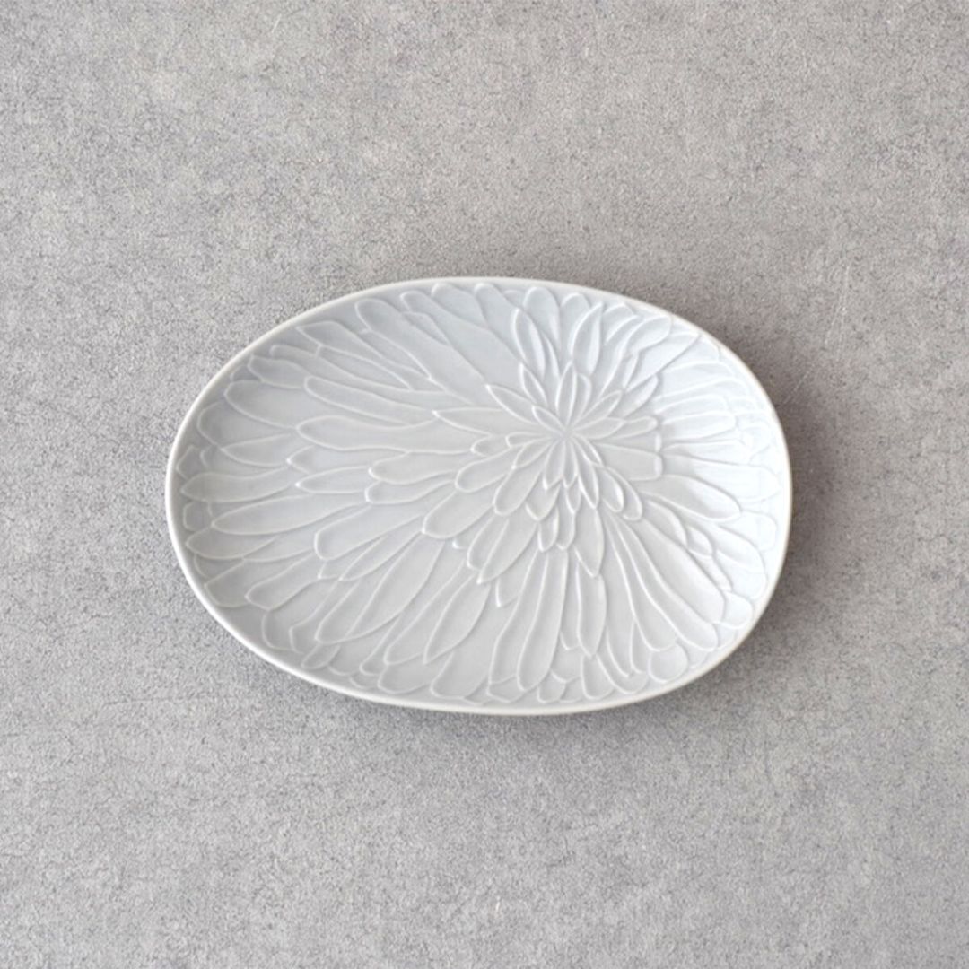 満開の花びらのレリーフと左右非対称が特徴的な楕円形の取皿です。テーブルに配置しやすく、使いやすい大きさです。