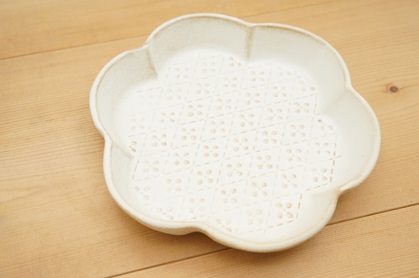 ポコポコした小花柄のレリーフが魅力。サイドメニューやデザートにぴったりな中皿サイズです。