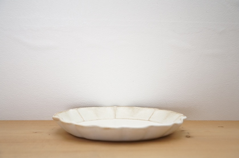 ふちの立体的なフリルが可愛い益子焼の中皿です。